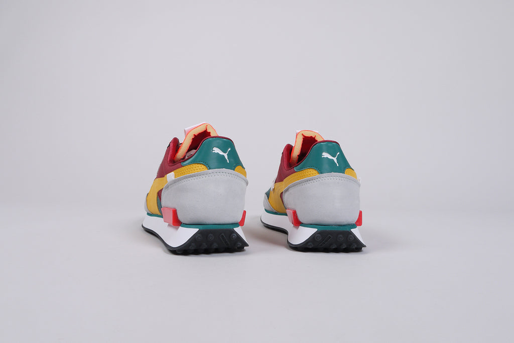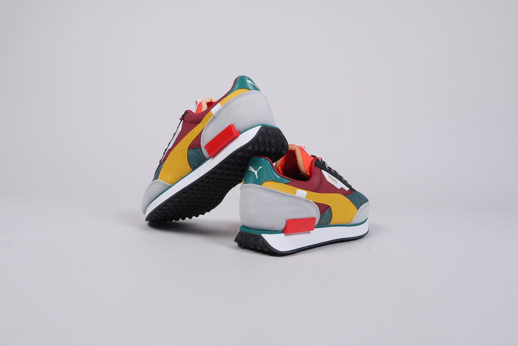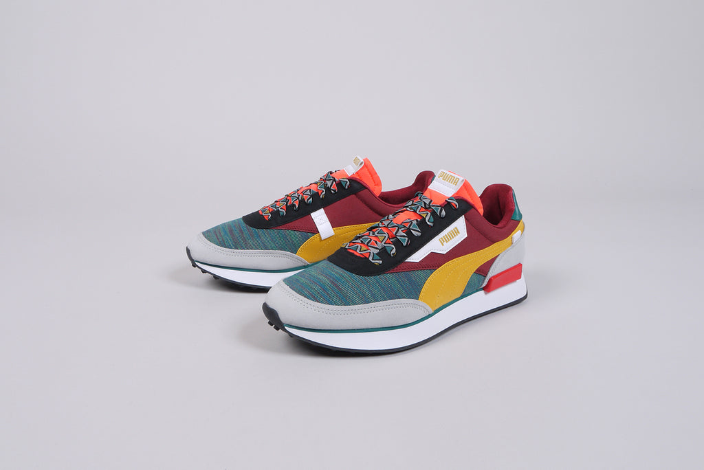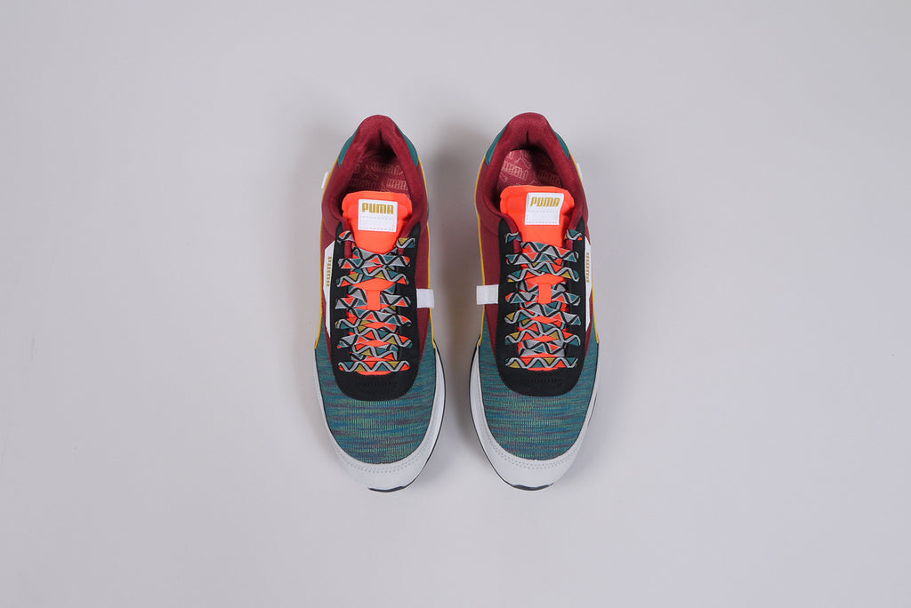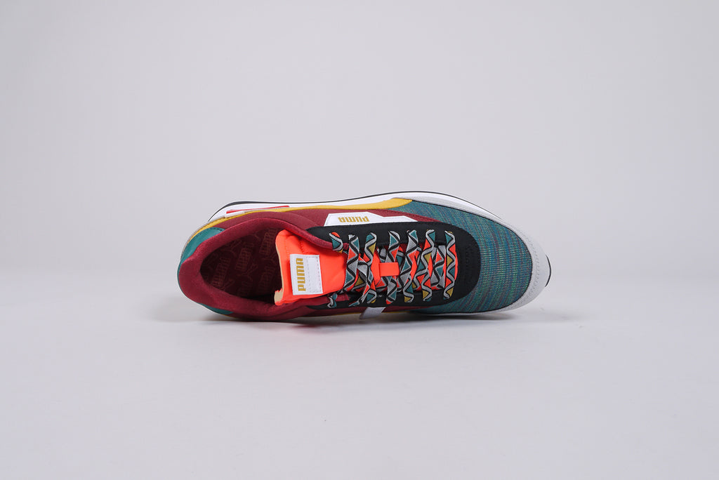 Der Puma Future Rider "Mix" in teal-green/burnt-rasset. Der MIX Pack ist von PUMA´s großer Rolle in der Fußballkultur Afrikas inspiriert. Markante, bunte Farben treffen ganz im Stile vergangener PUMA-Trikots auf ausgefeilte Muster.