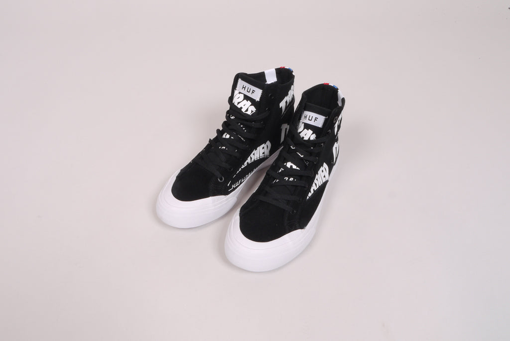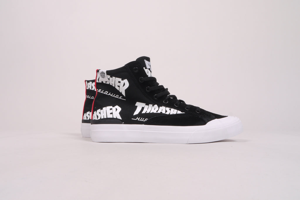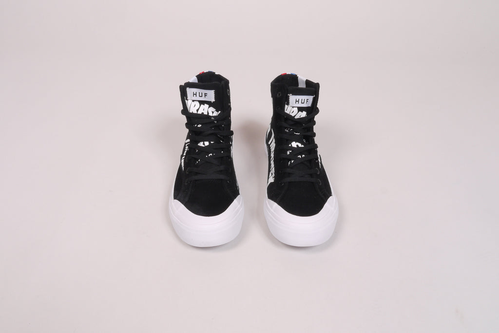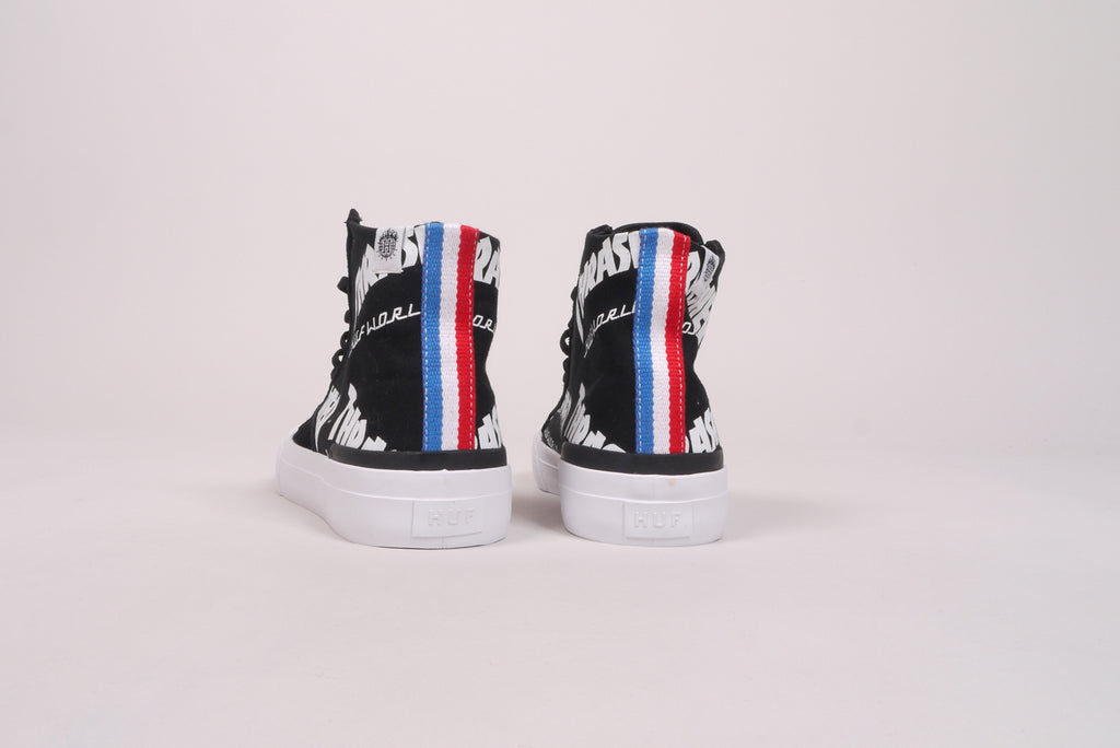 Der "Classic Hi" Schuh in schwarz aus der streng limitierten Huf x Thrasher Tour de Stoops Kollektion.