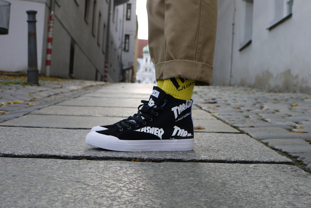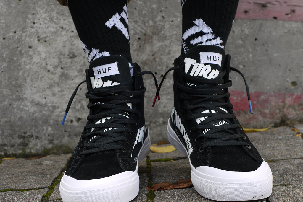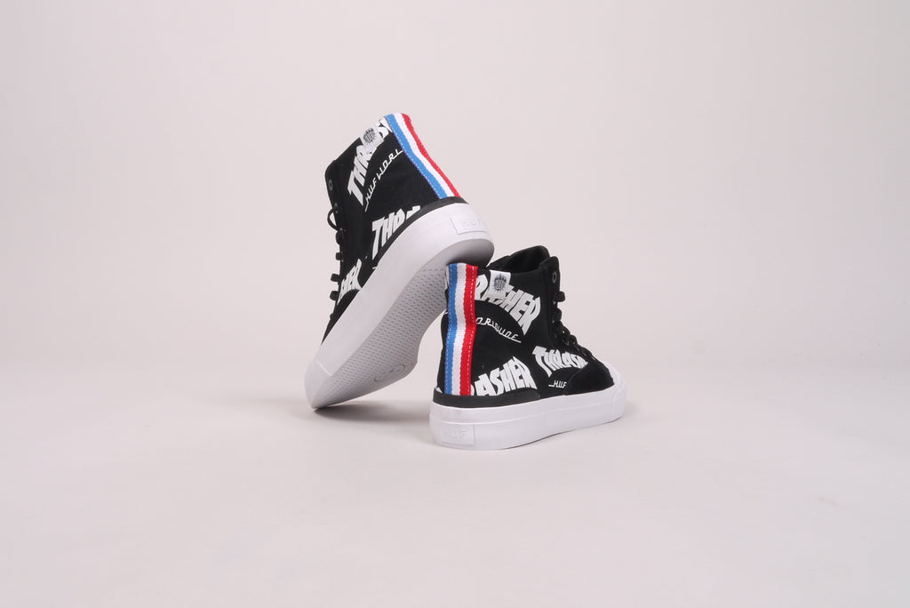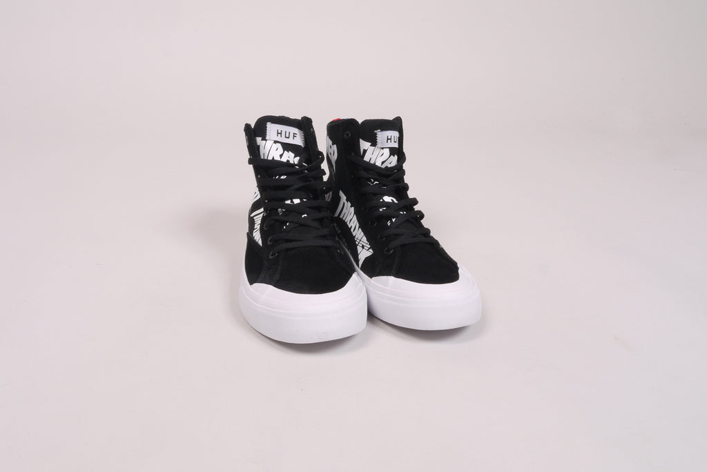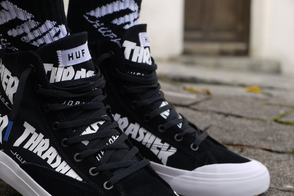 Der "Classic Hi" Schuh in schwarz aus der streng limitierten Huf x Thrasher Tour de Stoops Kollektion.