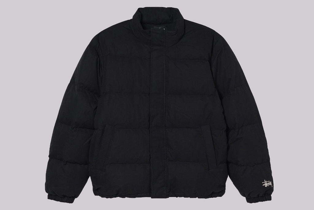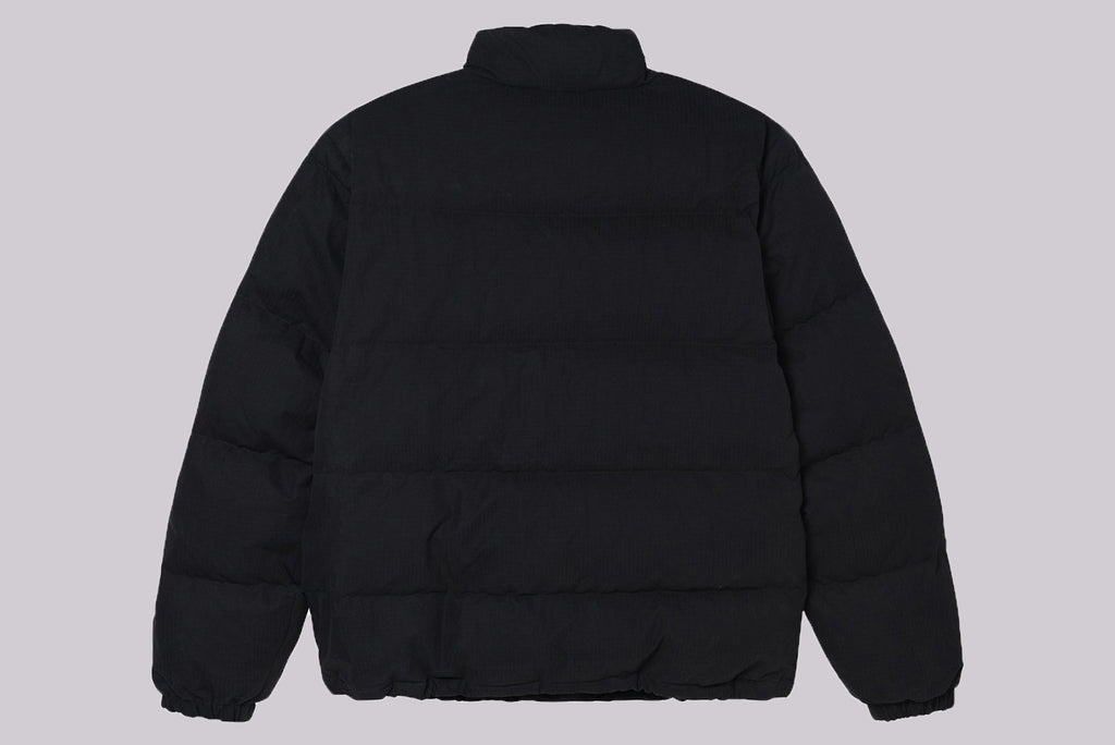 Stussy "Solid" Daunenjacke in schwarz mit gesticktem Logo auf dem linken Ärmel.