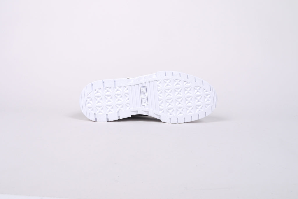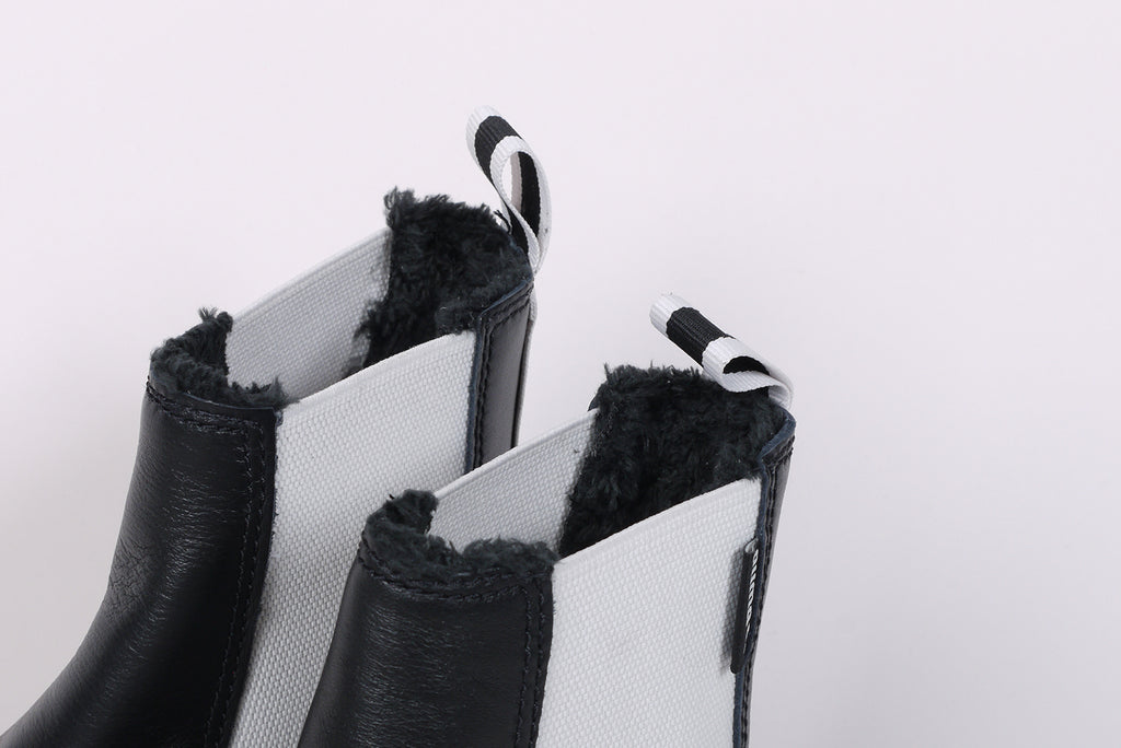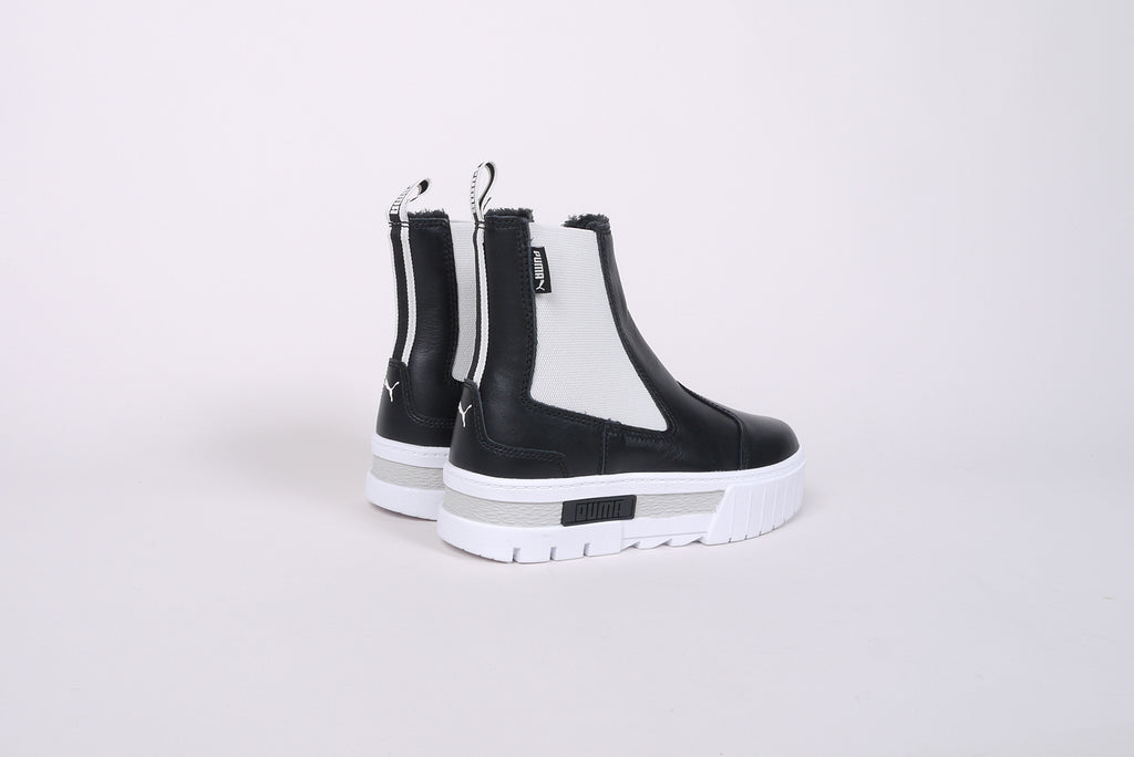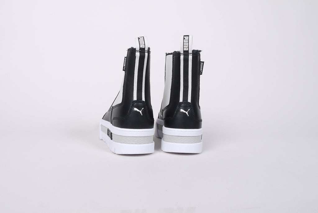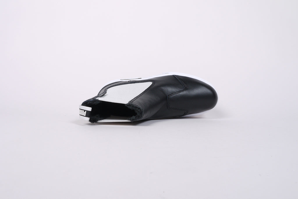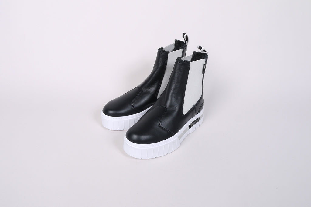 Der neue Puma "Mayze Chelsea Winter" Boot aus schwarzem Glattleder und weiß/grauen Details.
