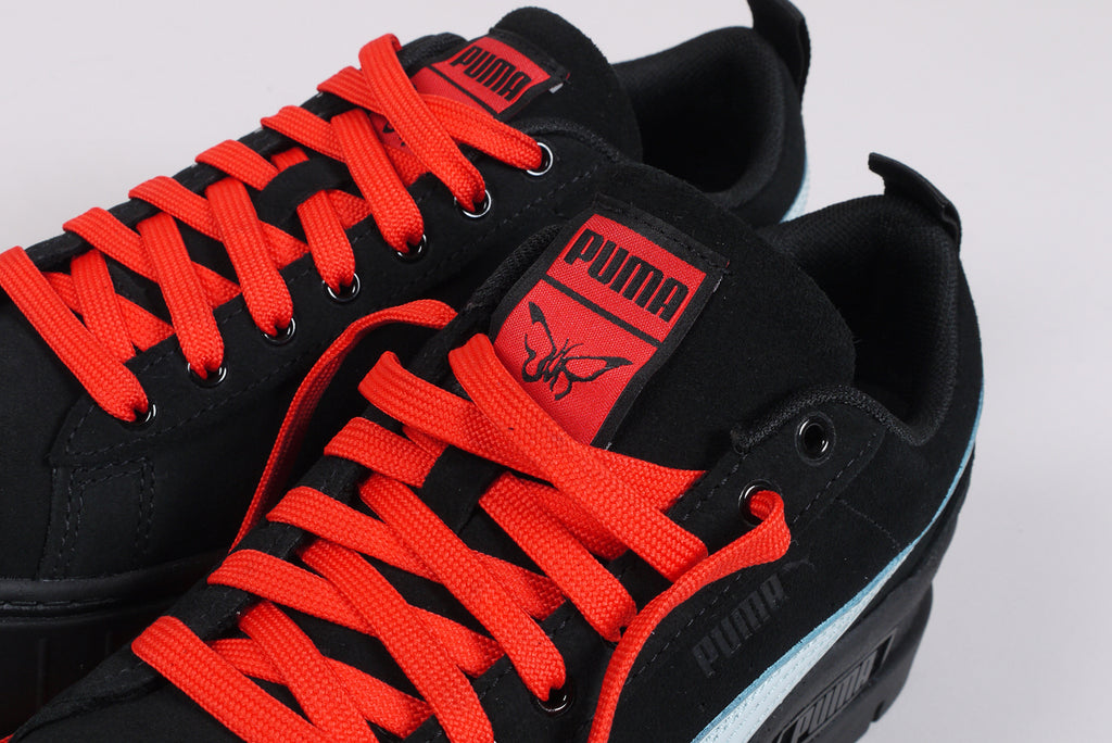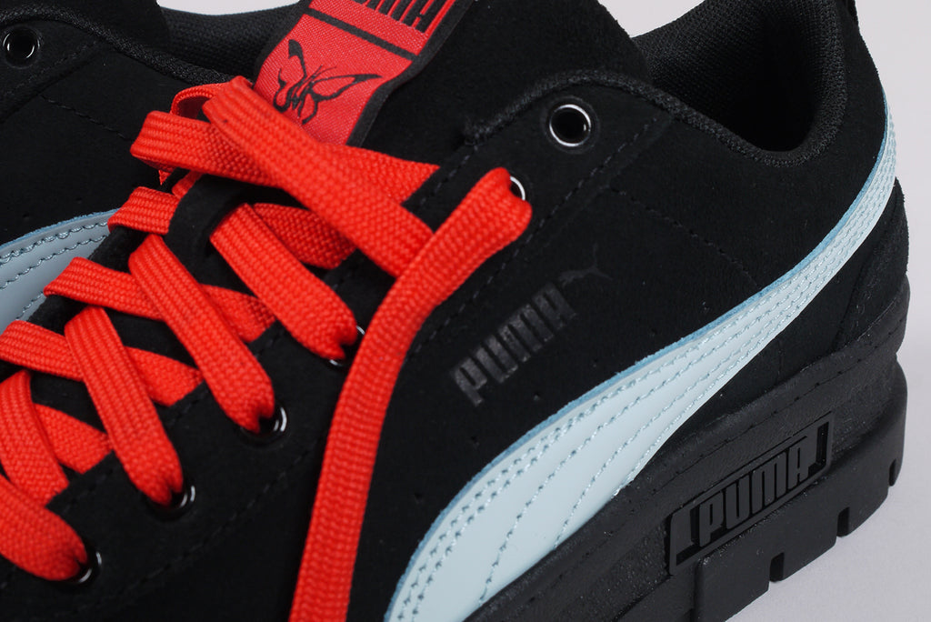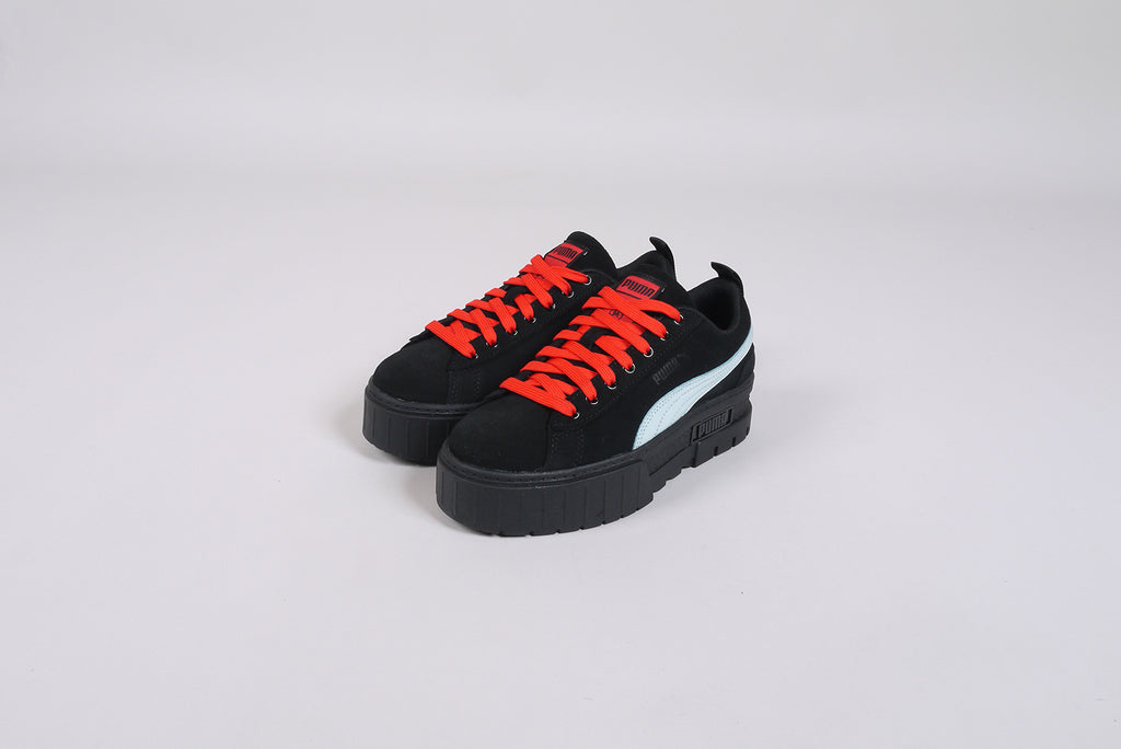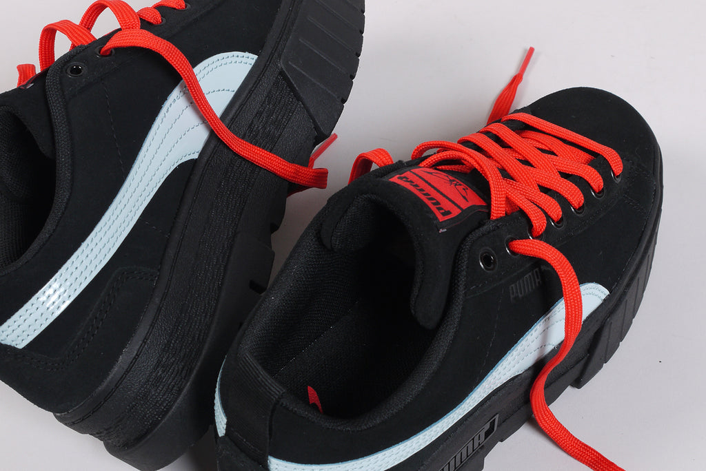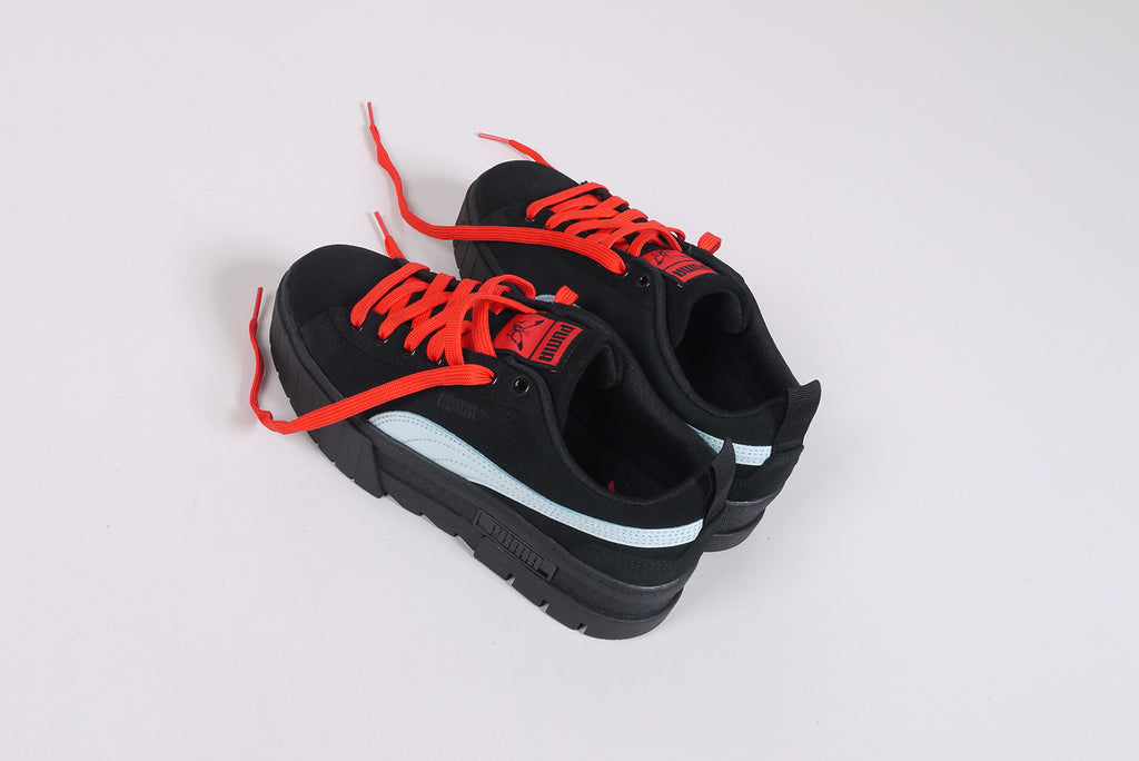 Der neue Puma Mayze SD von Dua Lipa aus schwarzem Wildleder, mit hellblauem Streifen und roten Schnürsenkeln. Limitierte Auflage.