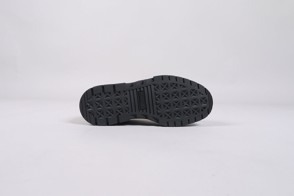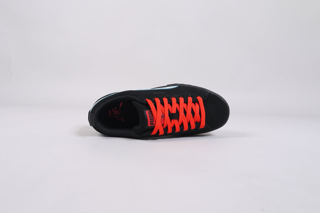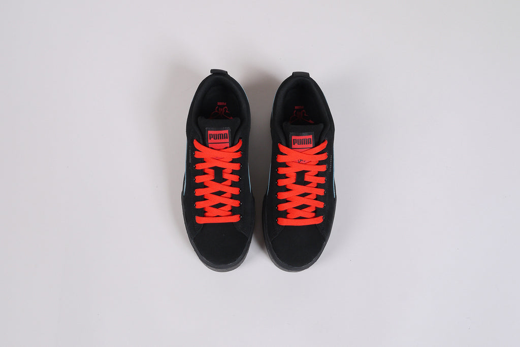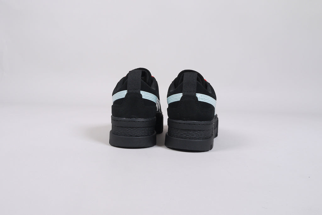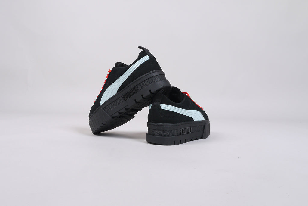 Der neue Puma Mayze SD von Dua Lipa aus schwarzem Wildleder, mit hellblauem Streifen und roten Schnürsenkeln. Limitierte Auflage.