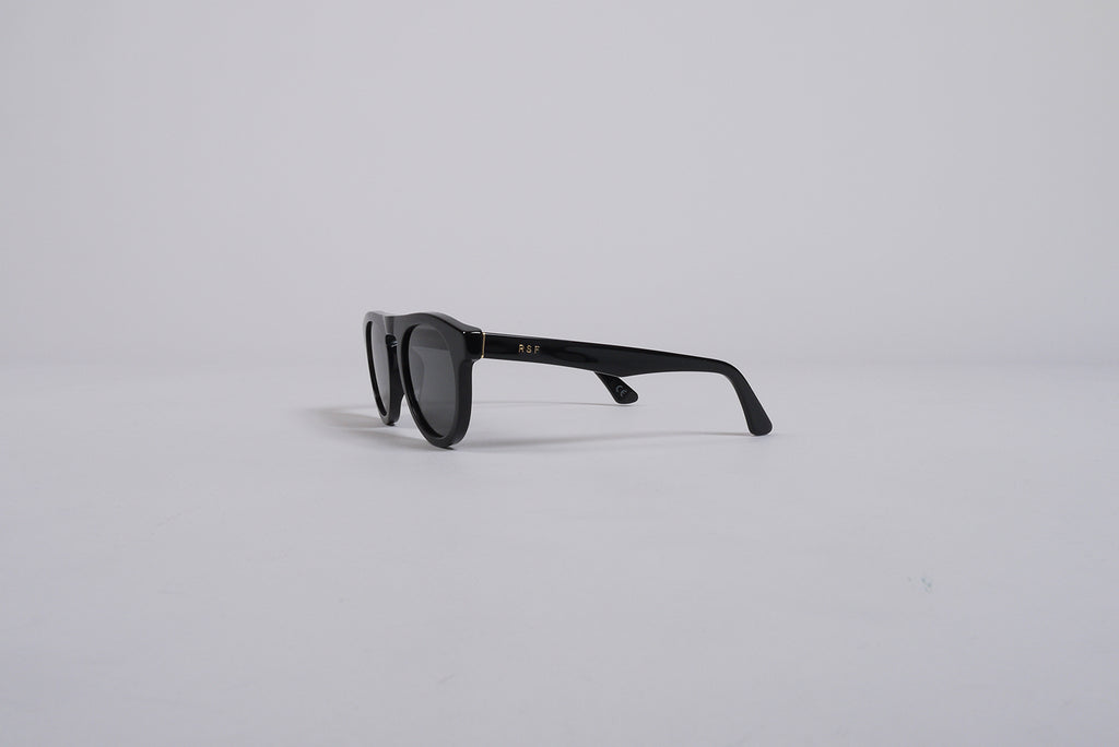 Die "Racer" Sonnenbrille aus dem Hause Retrosuperfuture. Die Linsen sind aus gehärtetem Barberini-Glas für ein präzises, technisches Gefühl und eine präzise Funktion. Die Brille kommt mit einem schwarzen Acetat und passenden Gläsern. Die Box enthält eine halbharte Lederhülle und ein Reinigungstuch.