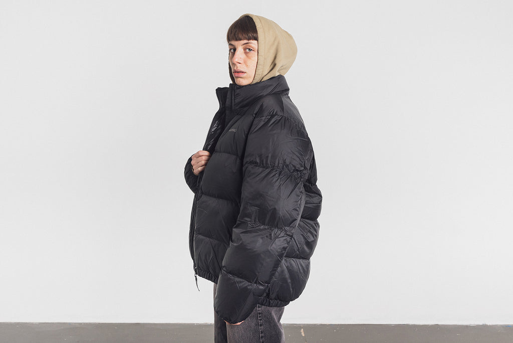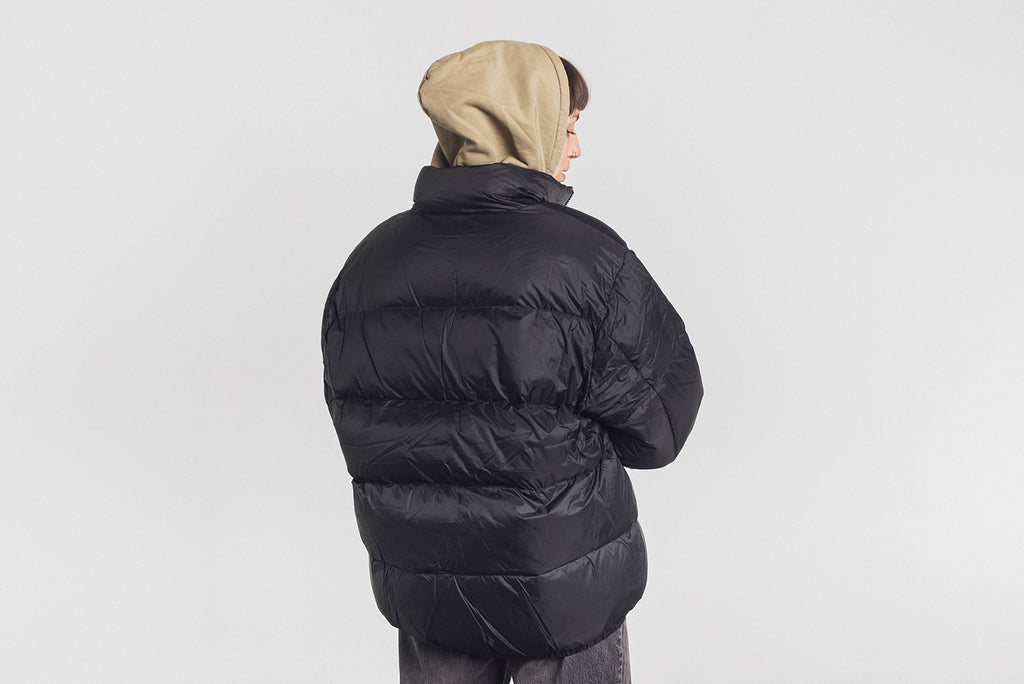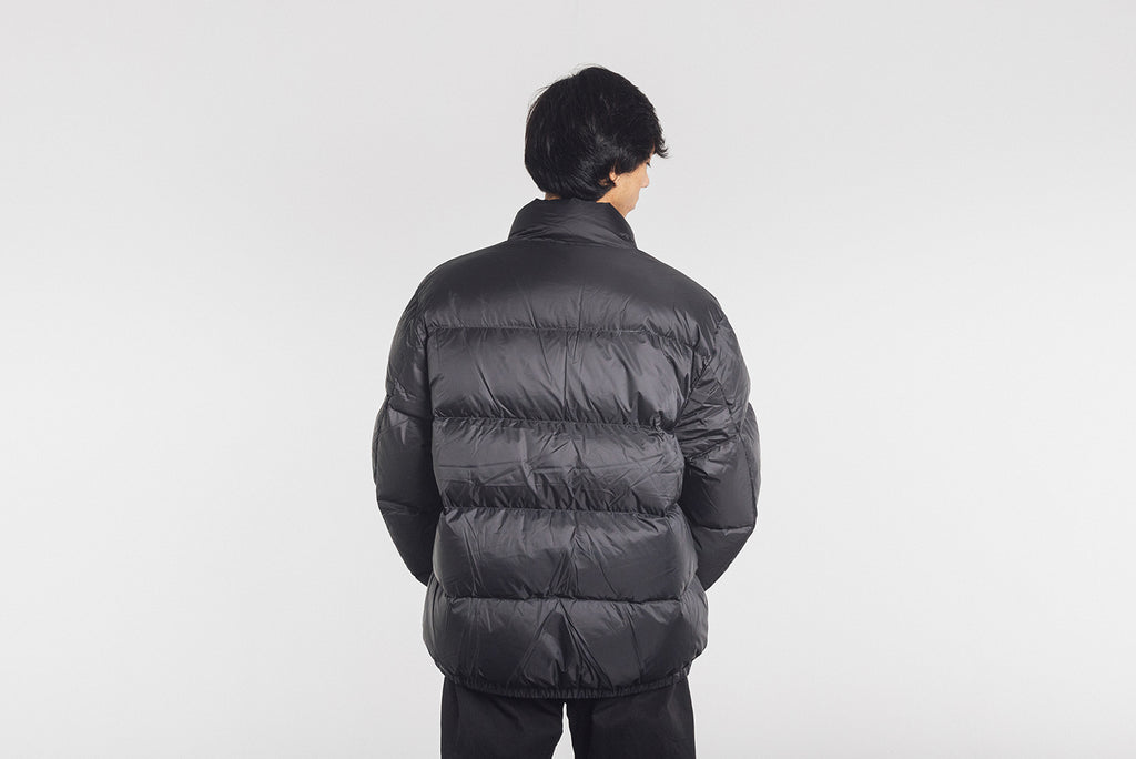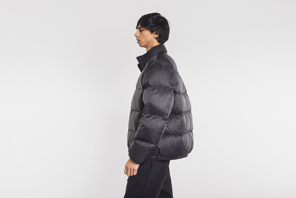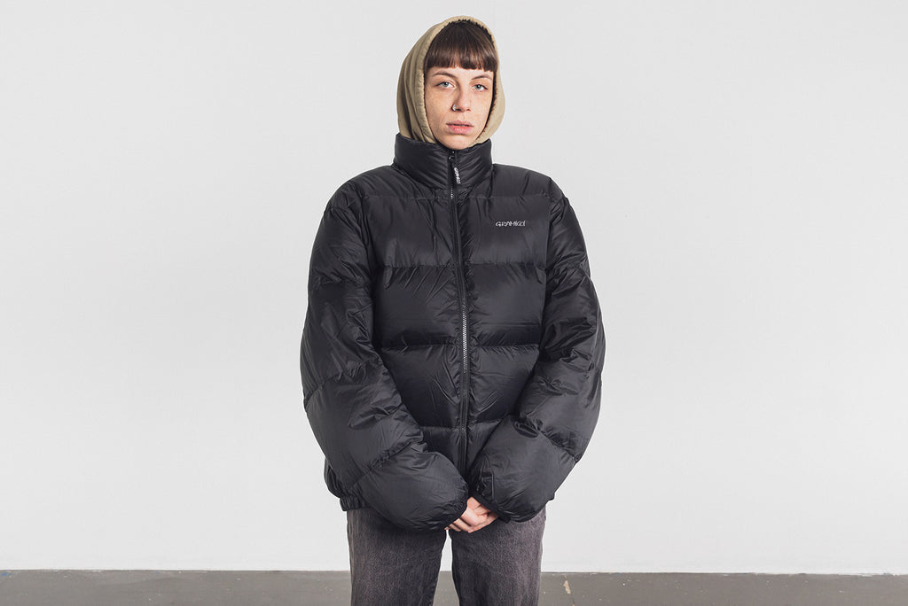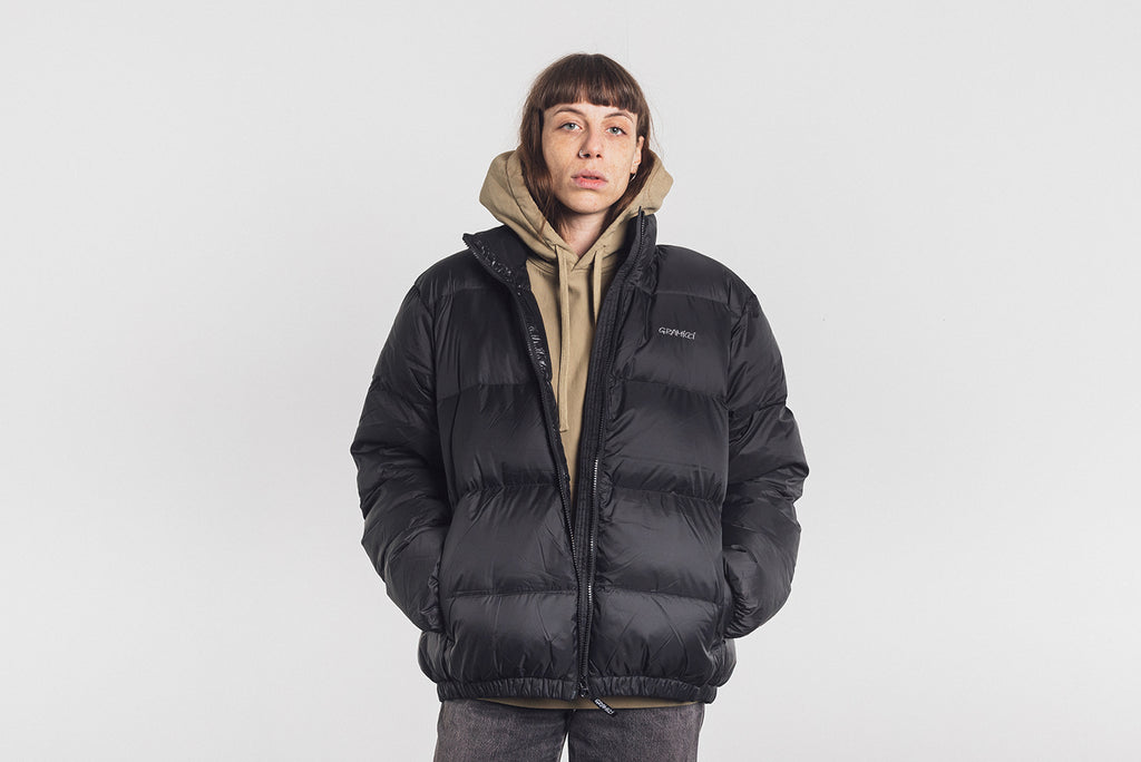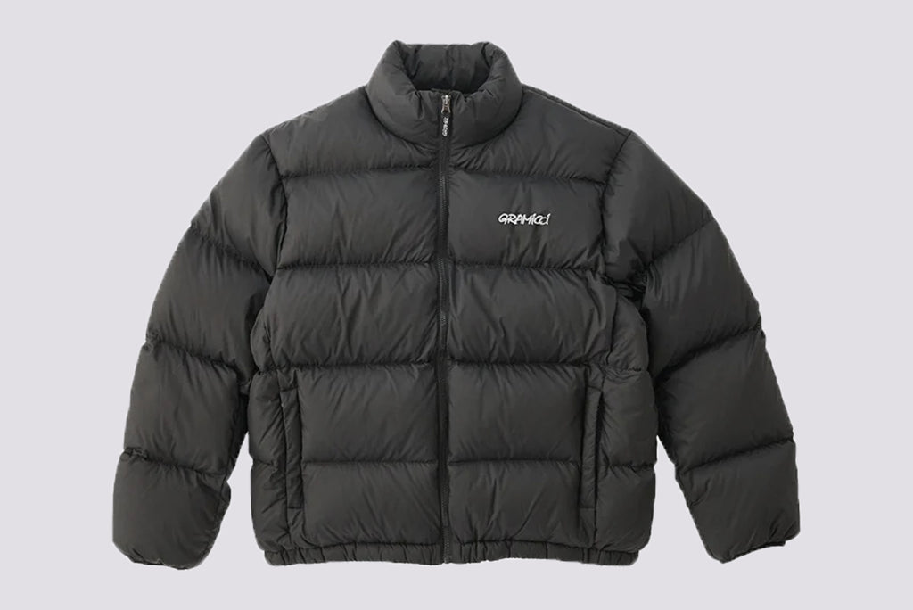 Gramicci Daunenjacke in schwarz mit gesticktem Logo auf der linken Brust.