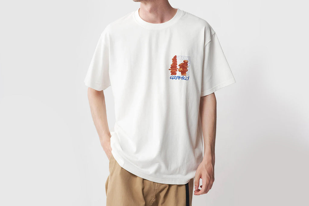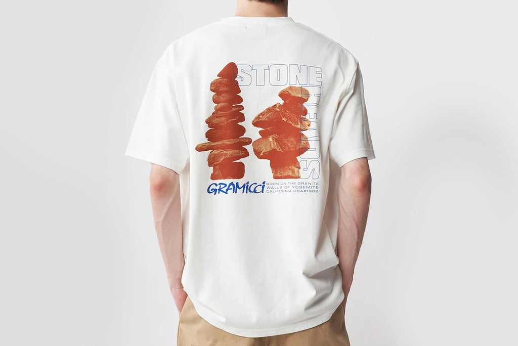 Das Gramicci Stoneheads Tee in weiß mit kleinem Frontprint und großem Design auf dem Rücken.