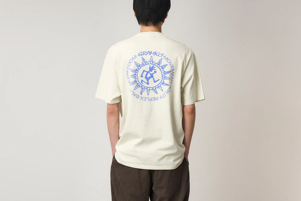 Gramicci Sun T-Shirt aus Öko-Baumwolle – mit Pigmentfärbung. Dies verleiht dem Shirt einen geschmackvollen Vintage-Look und einen tollen Tragekomfort.