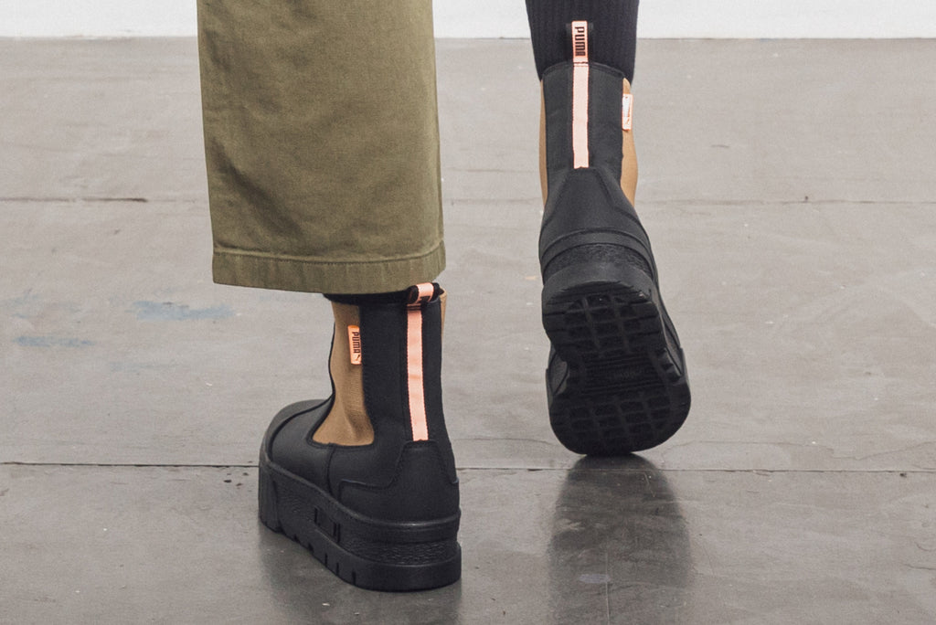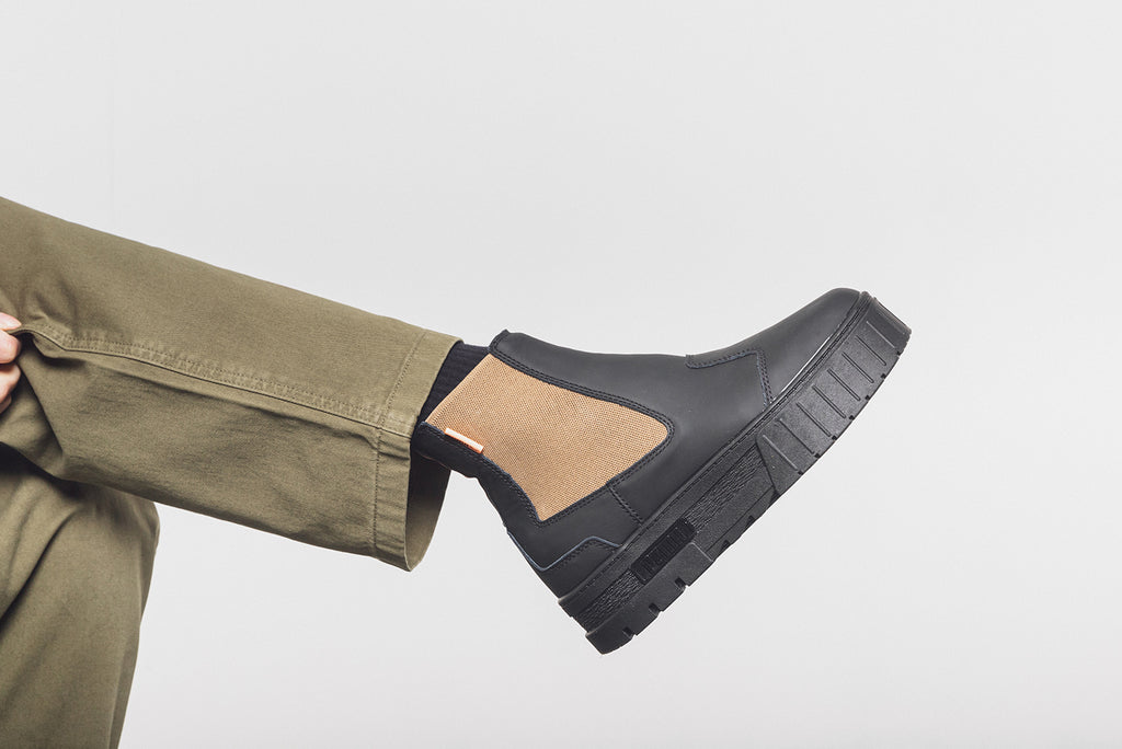 The new Puma "Mayze" Chelsea boot made of black smooth leather and brown details.