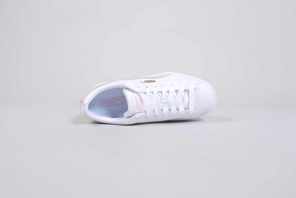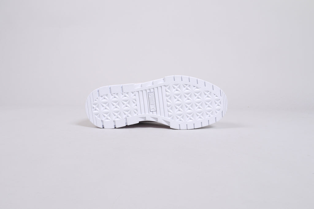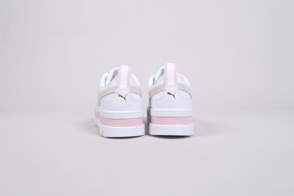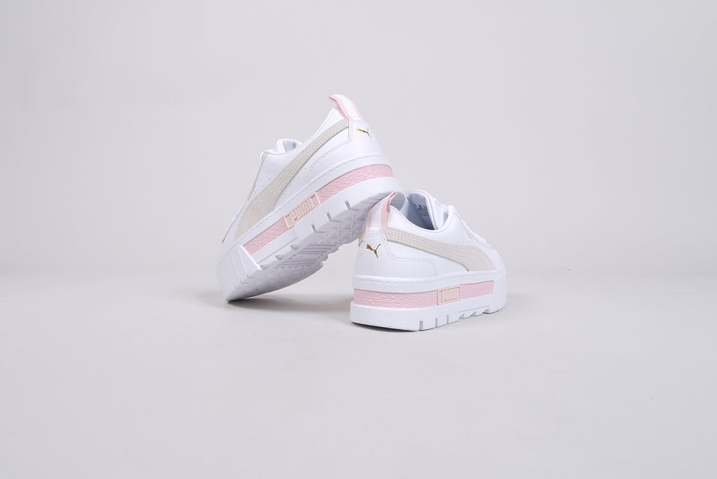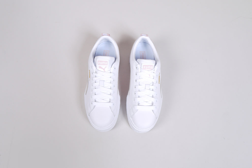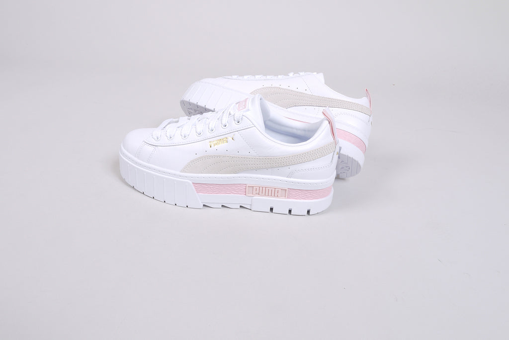 The Puma "Mayze Lth" in white/marshmallow. A great leather shoe in white with details in light grey and light pink. Trendy women's sneaker on a platform sole.