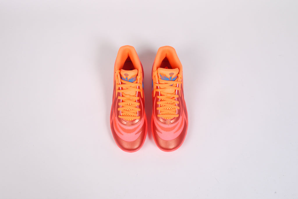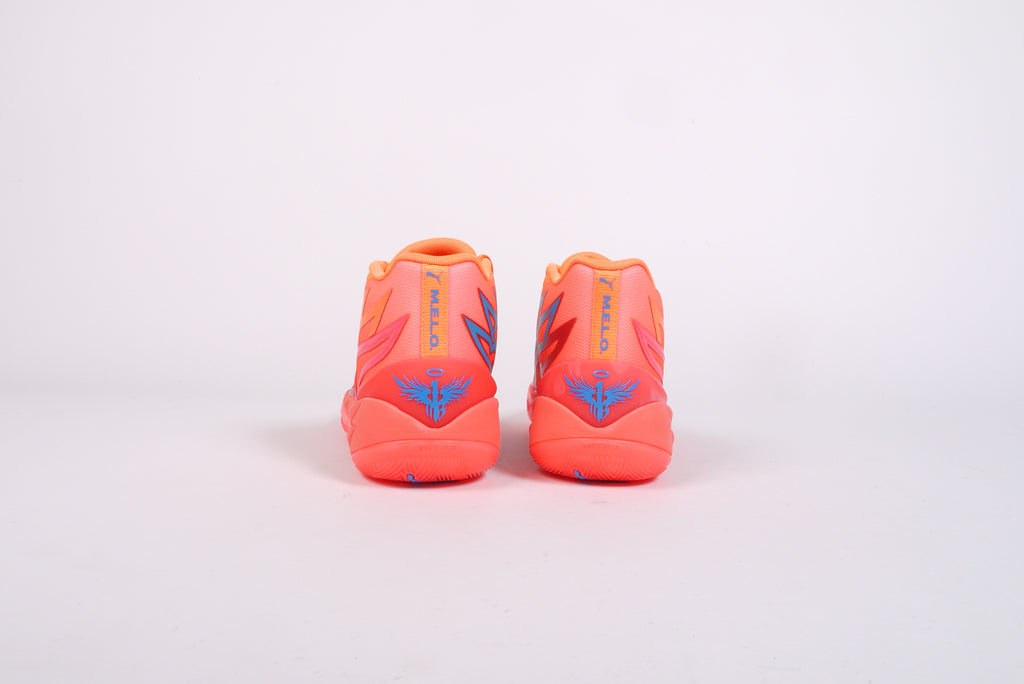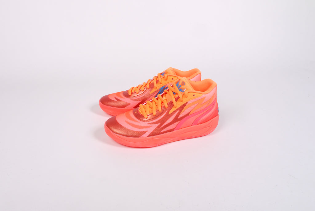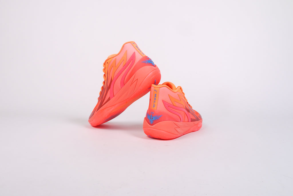 The Puma "MB.02", the latest shoe in LaMelo Ball's extraordinary PUMA Hoops lineup. The foundation for this new silhouette is a NITRO Foam-filled midsole that mimics Melo's signature wings. The theme continues on the mesh upper in epic size.