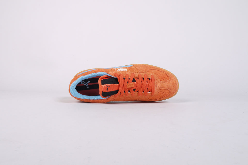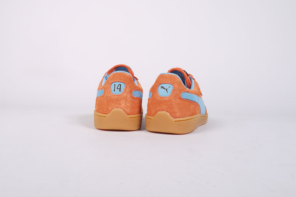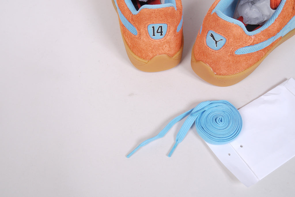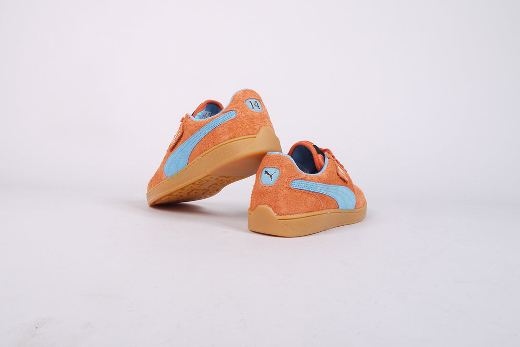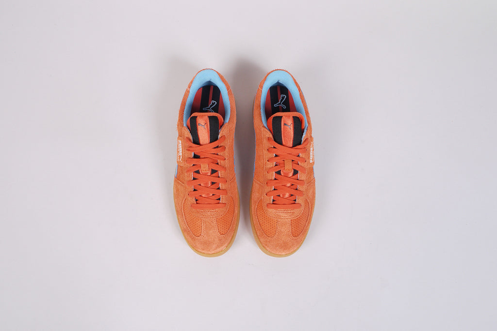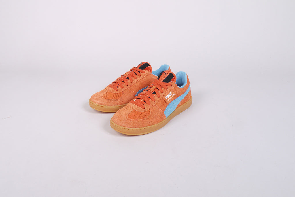 The Puma "Super Team No. 14" in a great orange/light blue version. This sneaker comes in a classic and timeless shape. Influences can be seen especially from indoor soccer and tennis.
