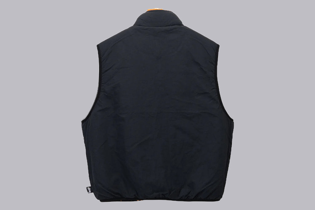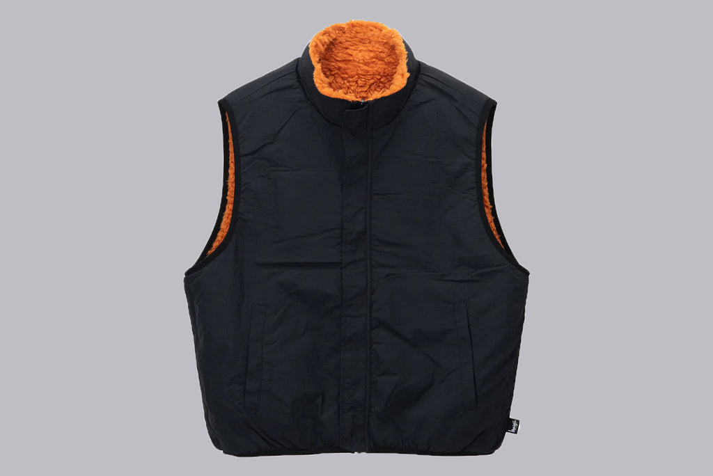 Stussy Sherpa Vest in orange. This vest can also be turned inside out so you can wear it in black.